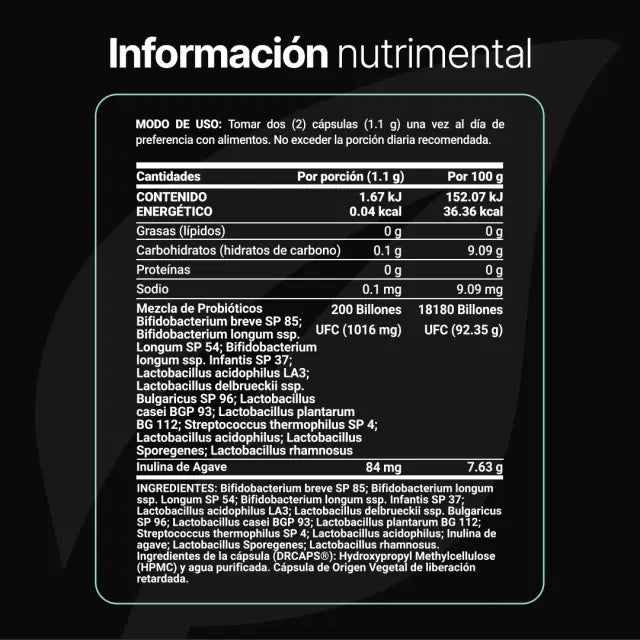200 Billion Probiotics B Life® contiene 1100 mg por cápsula en una formulación que combina 11 cepas de probióticos junto con inulina de agave. Sus cápsulas están elaboradas con tecnología DRcaps®, diseñada para una liberación retardada aproximada de 45 minutos después de la ingesta.